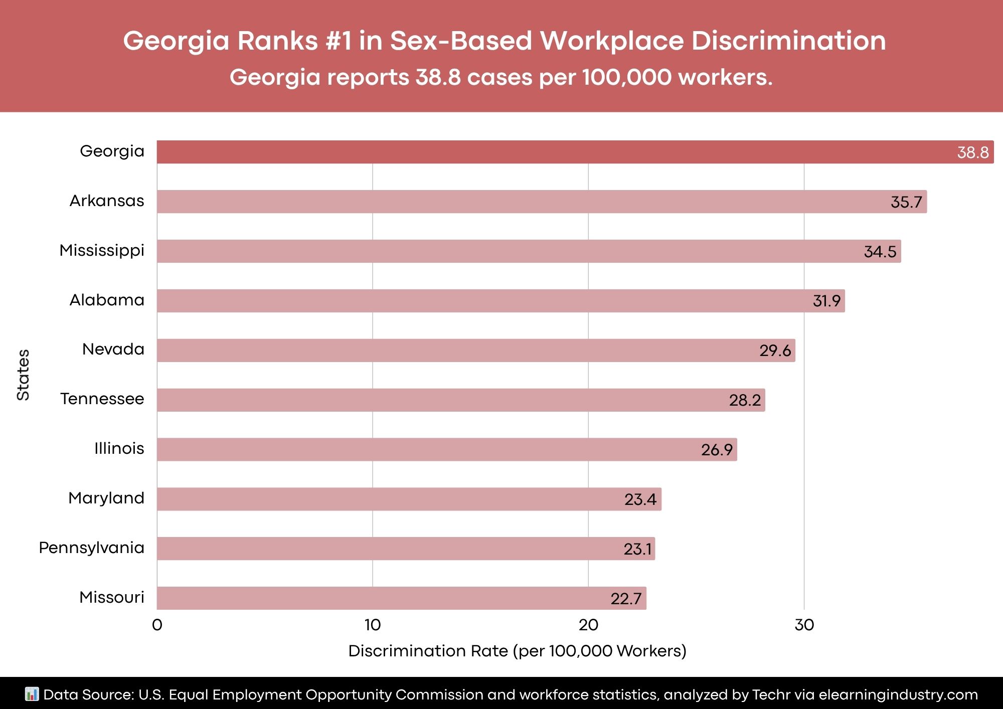 📉 What’s Happening: A new study by Techr, an online HR platform, crunched the latest numbers from the Equal Employment Opportunity Commission. The results? Georgia leads the nation with a whopping 38.8 sex-based discrimination cases per 100,000 workers—162% higher than the national average.