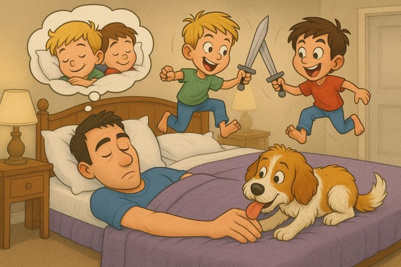 Lastly, we turn out the lights, and they play while they’re supposed to be sleeping. I don’t care because I’m officially off duty now. The sounds of giggling and thumping from upstairs could indicate they’re building a rocket ship or planning a coup—either way, it’s tomorrow’s problem.