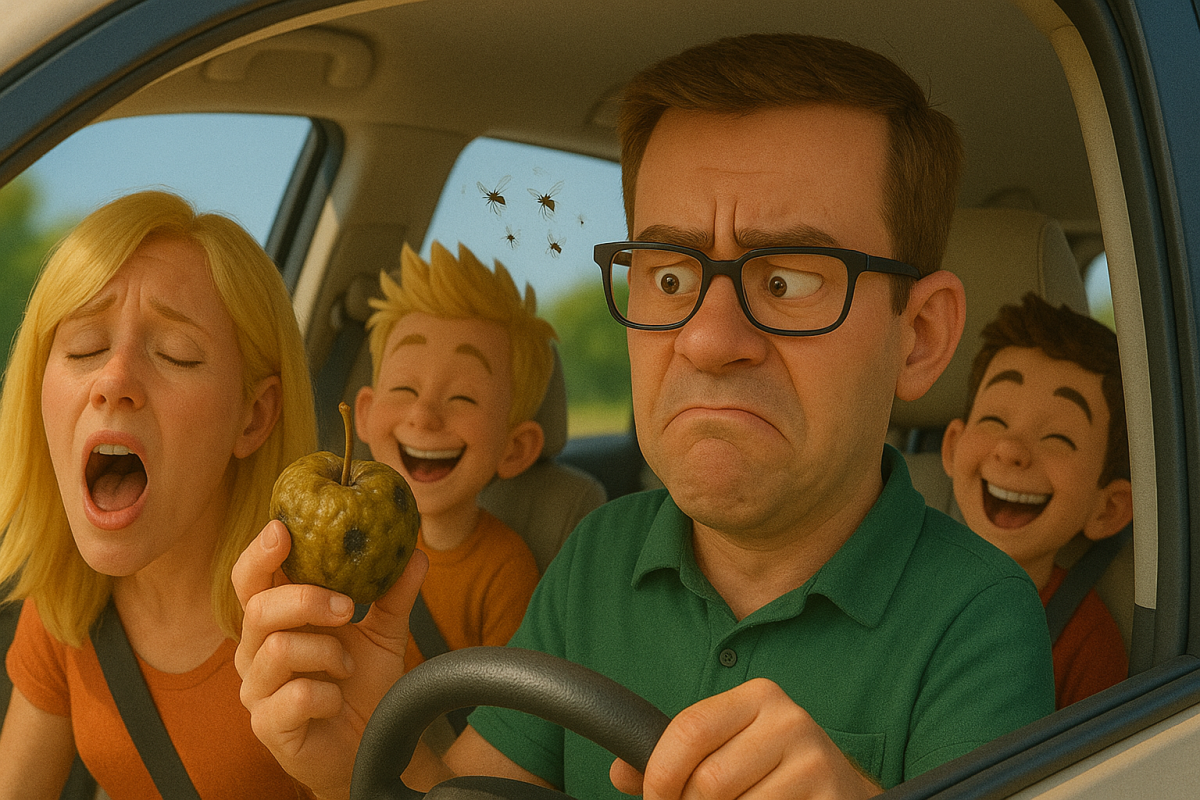 The apple was immediately discarded. The gnats and the smell took a little longer to clear. I think the car finally got back to normal after about 57 “when will we get there’s.”