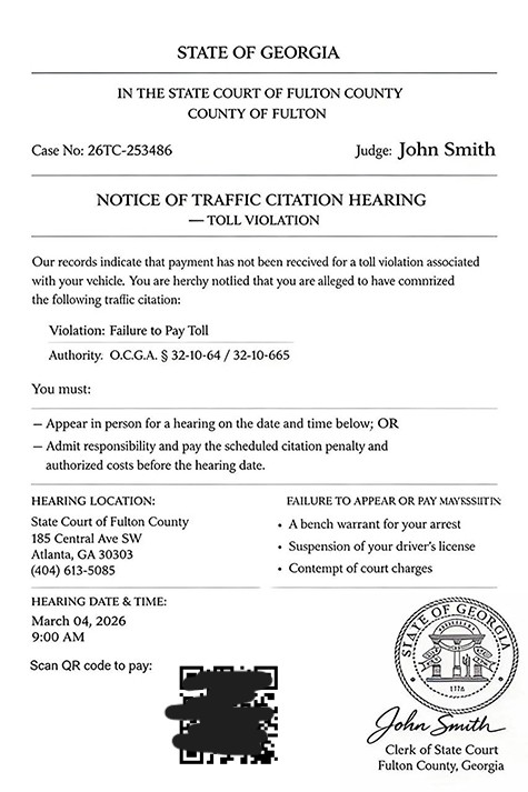 A notice telling people they must appear in court for a toll violation is fake, the Fulton County Sheriff’s Office says.