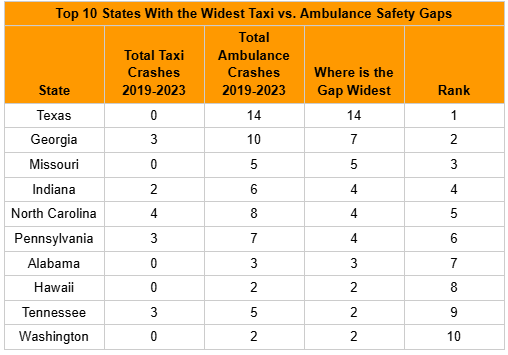 The research analyzed crash data from the National Highway Traffic Safety Administration (NHTSA) for taxi and ambulance crashes from 2019 to 2023 across all 50 states. The study calculated the total crashes for each vehicle type to identify the top 10 states where the safety gap is most pronounced.