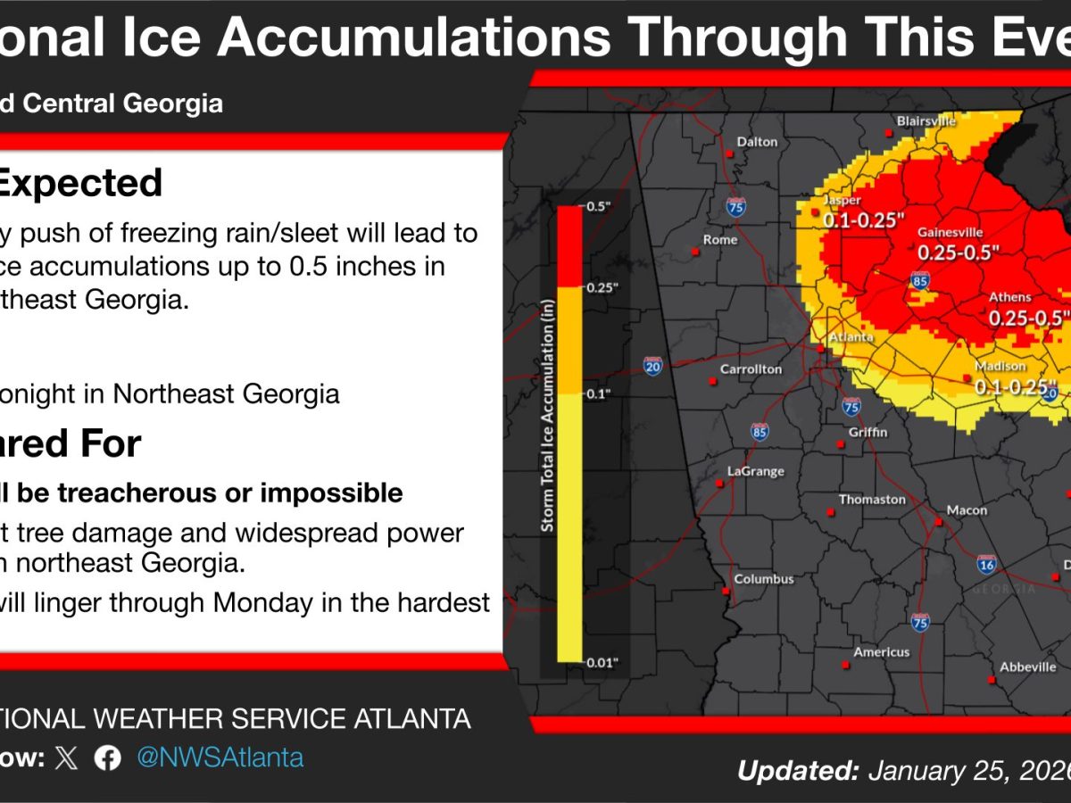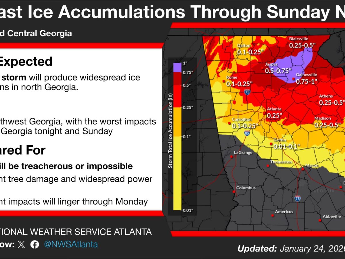 The National Weather Service has issued updated ice accumulation forecasts for north and central Georgia through Sunday night. What’s Happening: A major ice storm is forecast to produce ice accumulations across north Georgia. The storm begins today in northwest Georgia, with the worst impacts in northeast Georgia and Atlanta expected Sunday. What’s Important: Ice accumulations […]