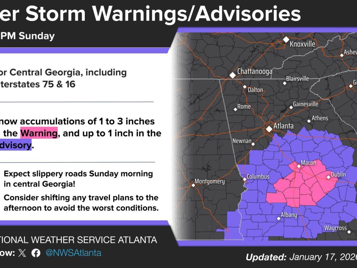 The National Weather Service upgraded part of central Georgia to a Winter Storm Warning and increased confidence in snow occurring Sunday morning. What’s Happening: A Winter Storm Warning is now in effect for parts of central Georgia from 3 a.m. to 1 p.m. Sunday. Areas under the warning could see 1 to 3 inches of […]