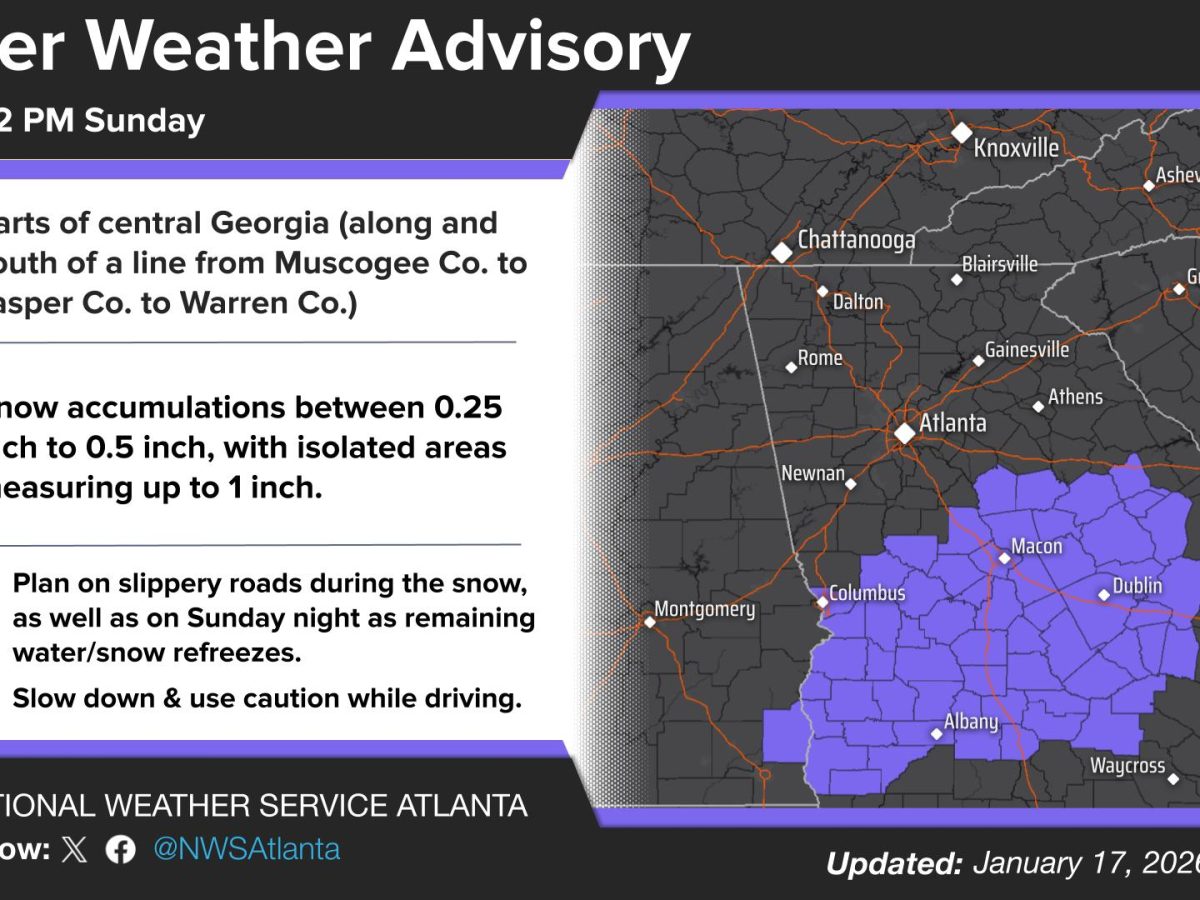 The National Weather Service’s Winter Weather Advisory for parts of central Georgia remains in effect from 3 a.m. to 12 p.m. Sunday. What’s Happening: The forecast hasn’t changed much from earlier predictions. Snow accumulations between 0.25 inch and 0.5 inch are expected, with up to 1 inch possible in localized areas. What’s Important: The advisory […]
