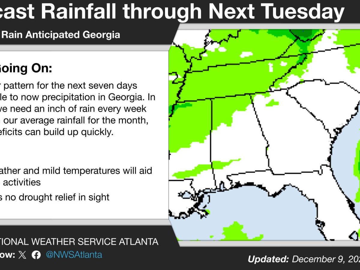 Georgia will see little to no rain through next Tuesday as dry conditions continue across the state. What’s Happening: The National Weather Service in Atlanta forecasts little to no precipitation for Georgia over the next seven days. Surrounding states will see rainfall, but Georgia will remain dry. What’s Important: December typically needs an inch of rain every […]