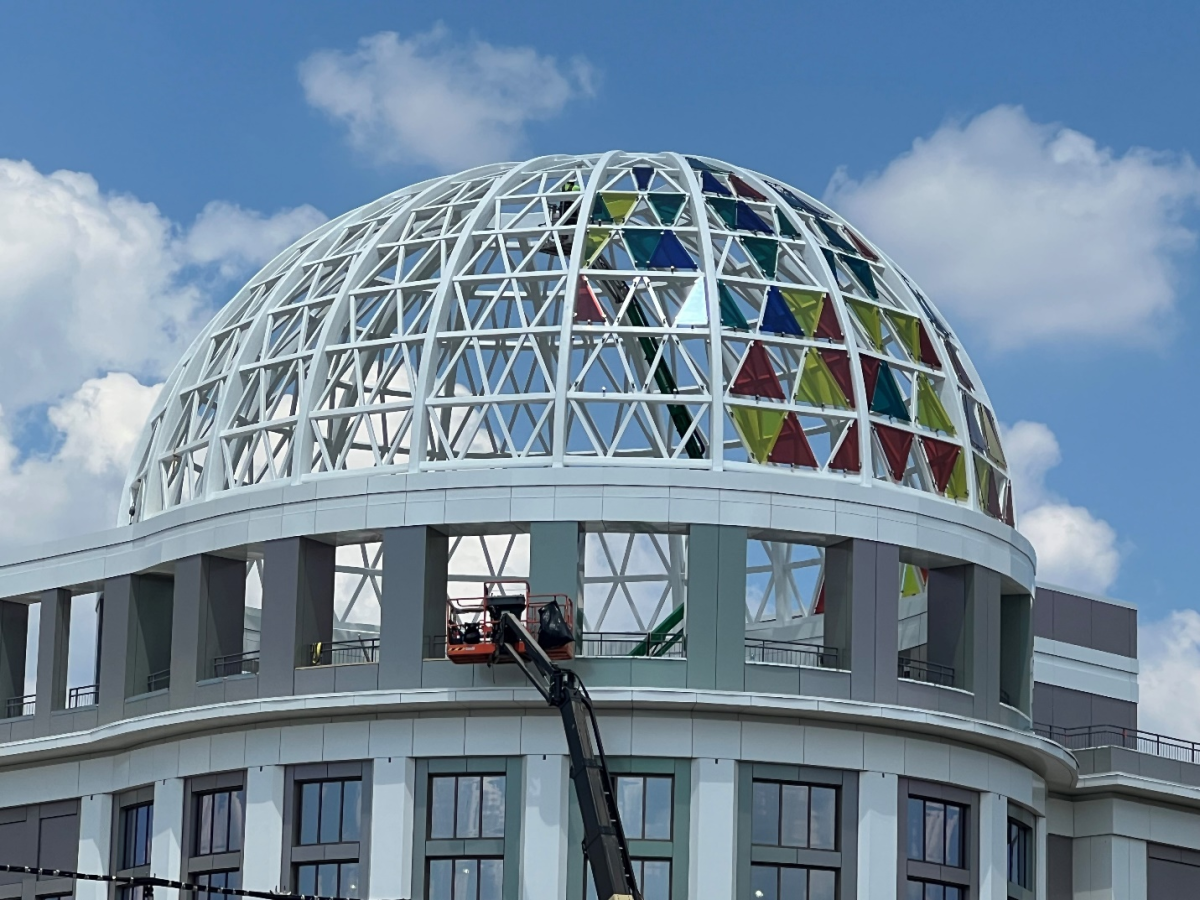 Brookhaven officials have ordered the removal of newly installed glass from the City Centre dome after it appeared “significantly brighter than expected.” According to a city spokesman, the city received some complaints from the public about the bright colors, but city officials were also evaluating the issue themselves.
