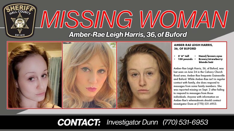 What’s Happening: Amber-Rae Leigh Harris, 36, of Buford, was last seen on June 24 in the Calvary Church Road area. She was reported missing on Sept. 2 after she stopped responding to messages from some family members.
