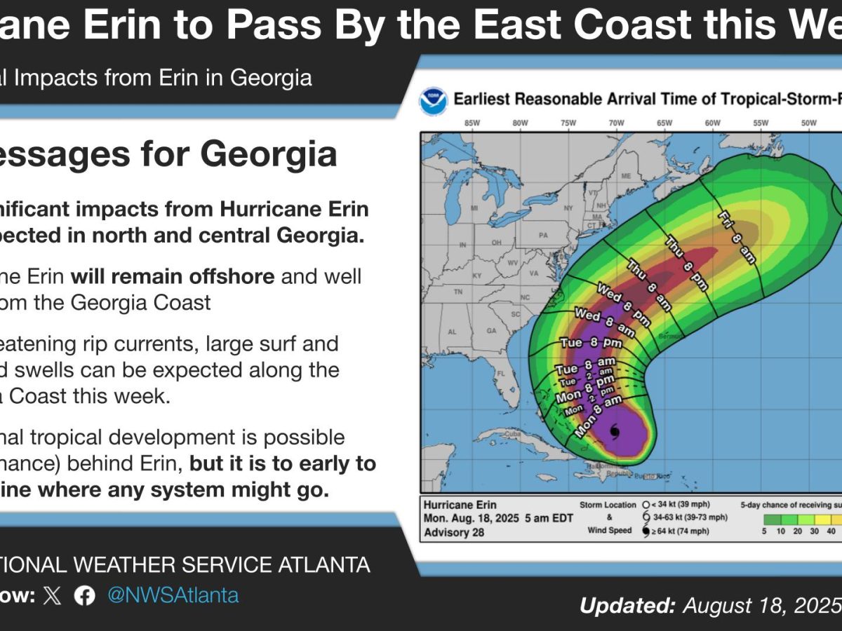 Hurricane Erin will stay offshore. Most of Georgia will miss the wind and rain. Beachgoers will not be so lucky. 🌊 What It Means For You: If you head to the Georgia coast this week, expect rough surf, strong rip currents, and big swells. North and central Georgia should see no big impacts. 🛰️ What’s […]
