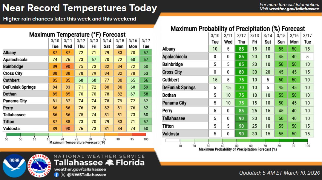 South Georgia is forecast to see near-record warmth today, March 10, before rain moves in later this week, according to the National Weather Service in Tallahassee. What’s Happening: The weather service released its forecast early this morning showing several South Georgia cities climbing into the upper 80s and low 90s today and Wednesday. Skies stay […]