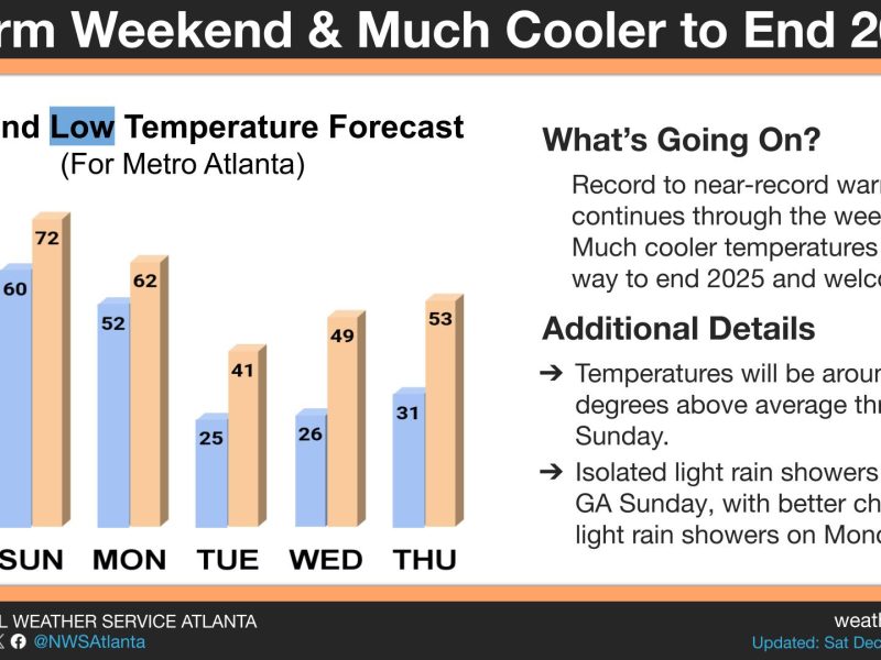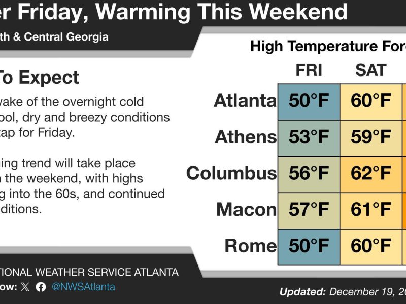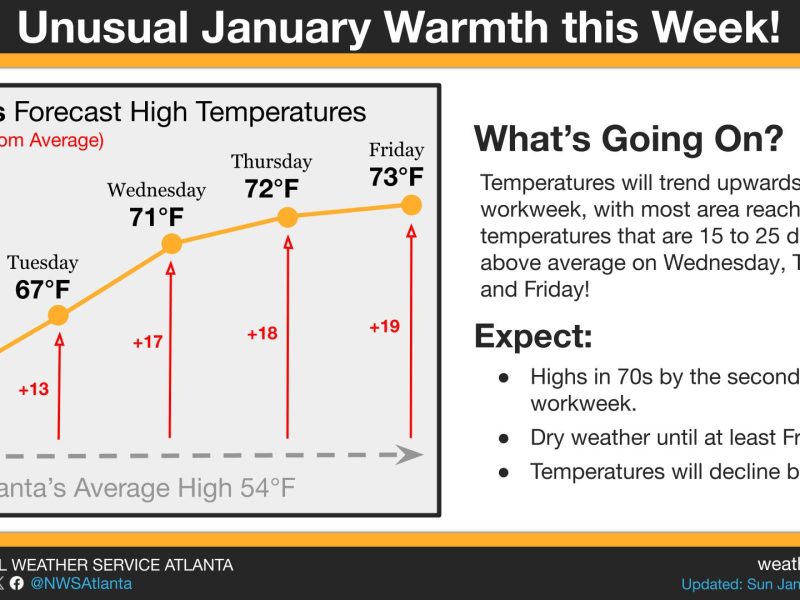 Temperatures around Atlanta will climb fast through the first half of next week before rain moves in, according to the National Weather Service. What’s happening: Sunday will be partly cloudy. Highs will reach 54 to 59 degrees, and lows will drop to 26 to 31 degrees. Monday brings morning clouds with highs of 61 to […]