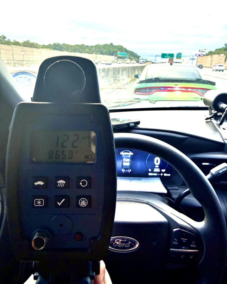 📸 What Happened: The Marietta Police Department shared a photo from inside a patrol vehicle showing a radar gun reading 122 mph. A brightly colored Dodge Challenger appears in the frame ahead of the officer’s vehicle on the highway.