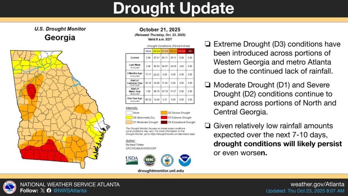 What’s Happening: The U.S. National Weather Service reports that extreme drought conditions now cover parts of western Georgia and metro Atlanta. Moderate and severe drought areas have also expanded across North and Central Georgia after a drier-than-average September and October.