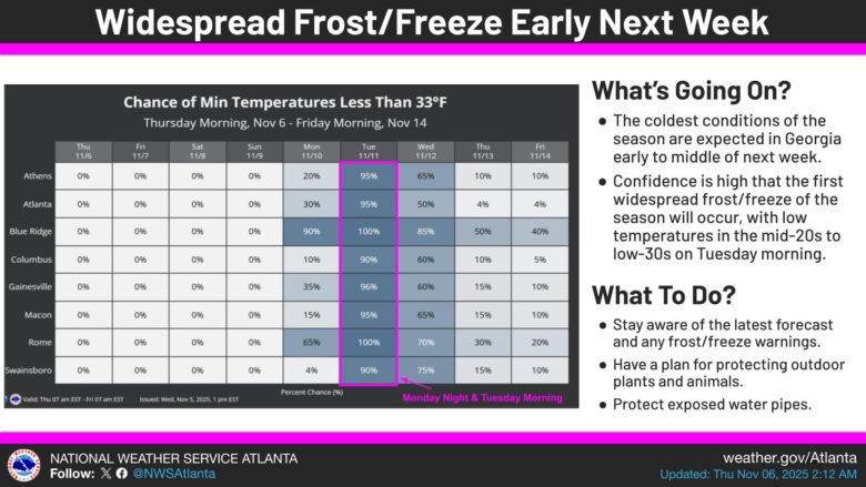 What’s Happening: A blast of cold air moves through Georgia between Sunday and Tuesday, bringing the state’s first widespread frost and freeze of the season. The National Weather Service shows high confidence in the forecast, with Tuesday morning delivering the knockout punch.