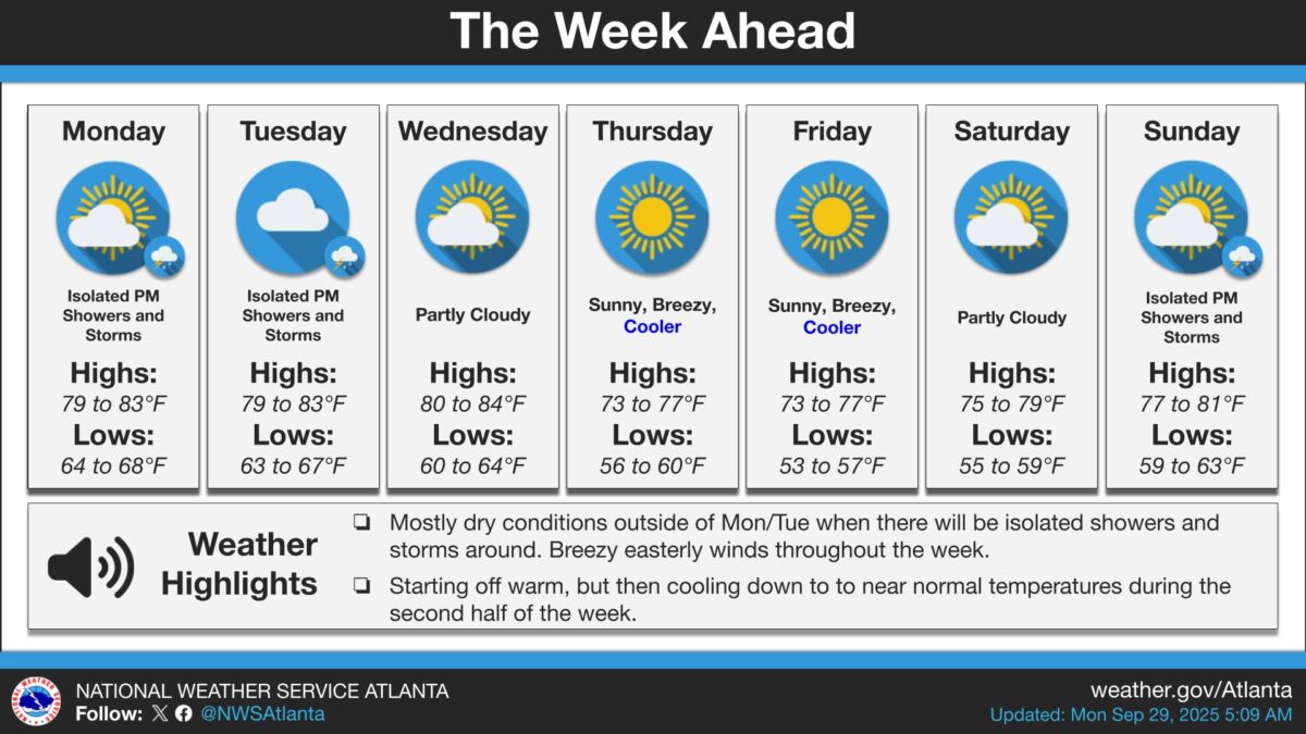 What’s Happening: The National Weather Service in Peachtree City forecasts isolated afternoon showers and storms through Tuesday, primarily affecting northeast and east-central Georgia. The rest of the state will experience mostly dry conditions with breezy easterly winds throughout the week.