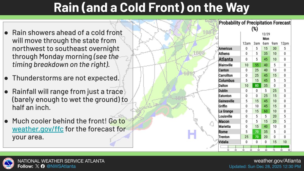 Rain showers are set to move across Georgia overnight into Monday morning as a cold front moves through the state, according to the National Weather Service in Atlanta.