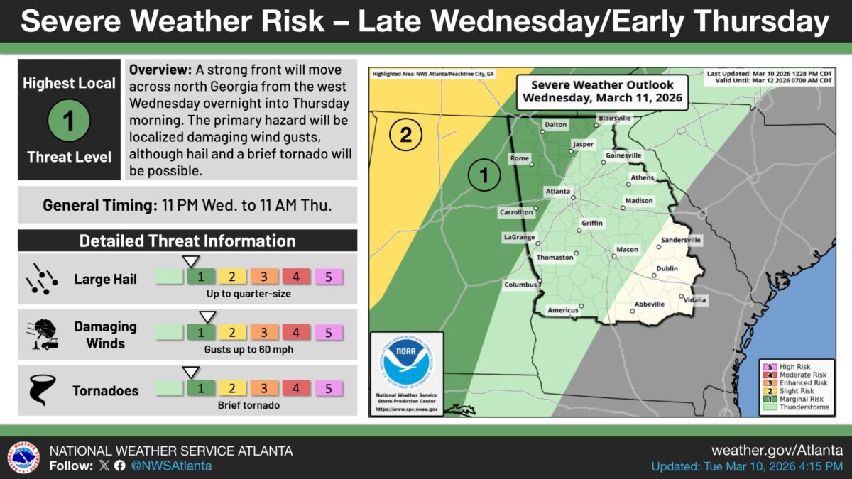 What’s Important: Not all storms are expected to be severe, but the weather service officials said a few could reach that threshold. North Georgia communities above I-85 face the greatest chance of dangerous conditions.