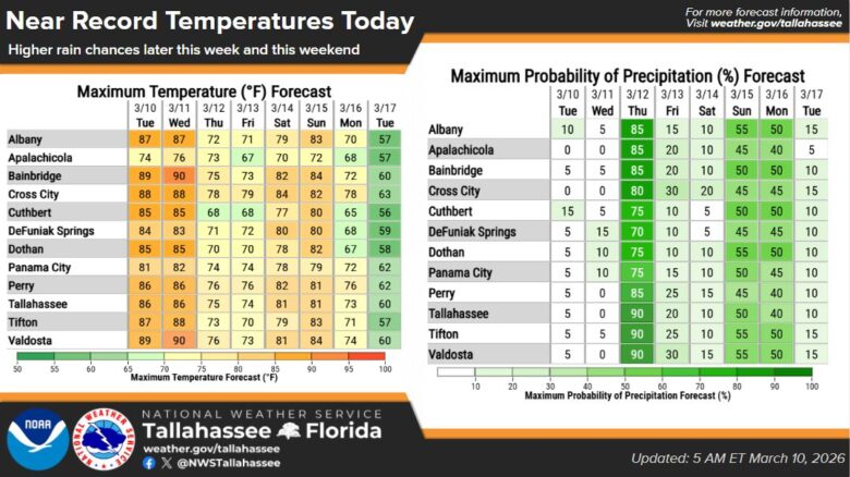 South Georgia is forecast to see near-record warmth today, March 10, before rain moves in later this week, according to the National Weather Service in Tallahassee.