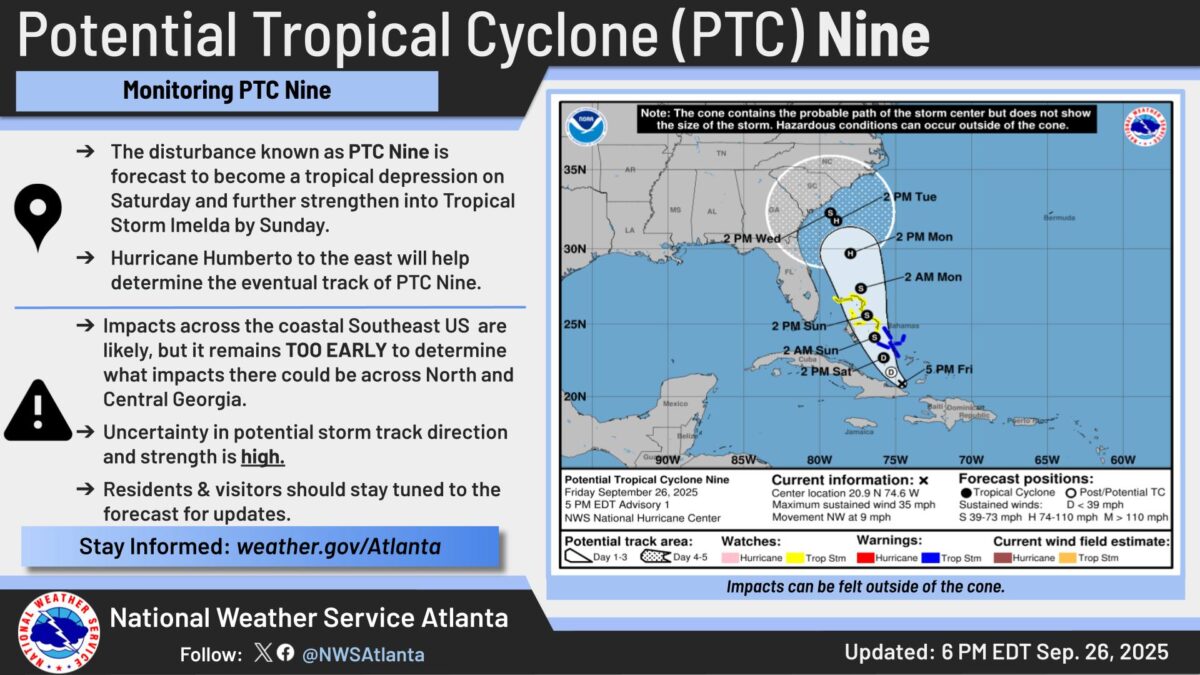 A weather system currently designated as PTC 9 is forecast to strengthen into Tropical Storm Imelda by Sunday, with coastal Southeast impacts likely in the coming days.