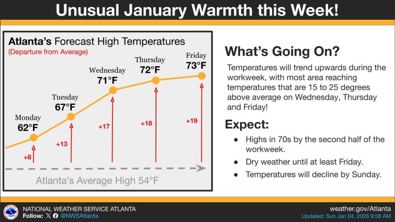 What’s Important: The biggest temperature jumps come Wednesday through Friday, when highs will run 17 to 19 degrees above Atlanta’s average high of 54°F for early January.