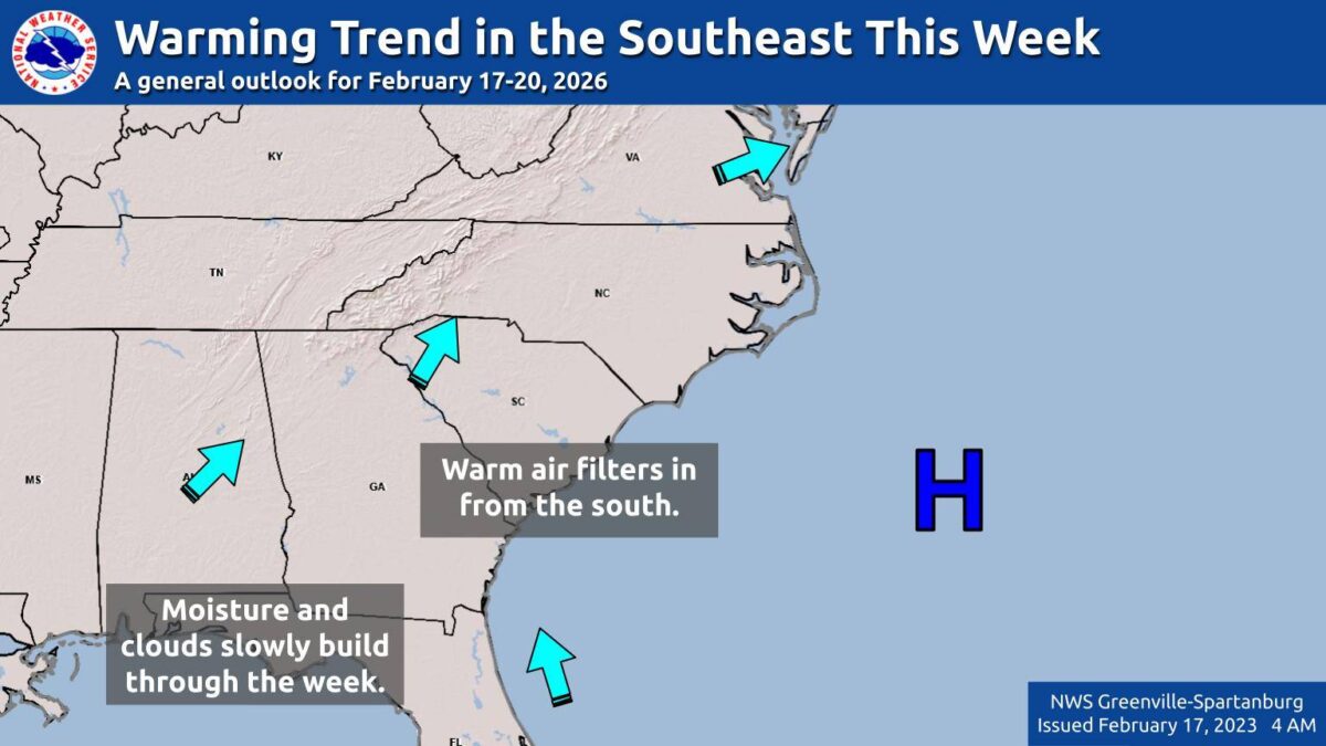 Warm air is moving into Georgia from the south through Friday, bringing higher temperatures and more clouds, according to the National Weather Service Greenville-Spartanburg.
