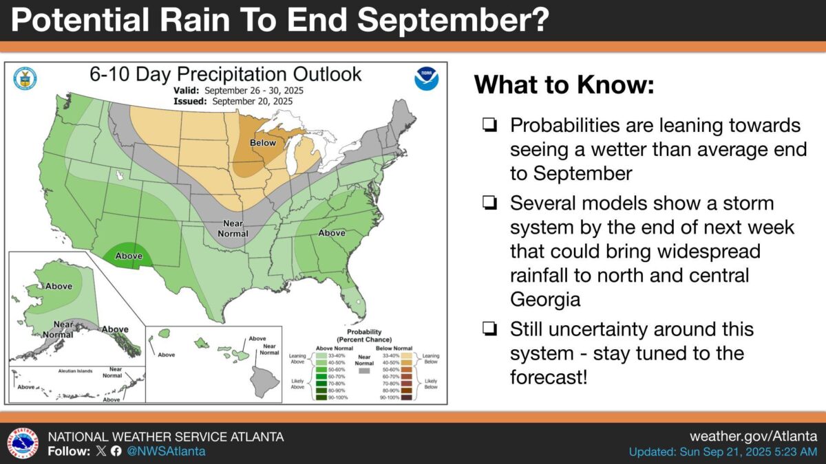 What’s Happening: Forecasters from the National Weather Service in Atlanta say the odds are leaning toward a wetter-than-normal end to September, pinpointing the period from September 26 to 30 as the window to watch. Multiple weather models are signaling that a storm system may push into the region by late next week, offering widespread rainfall for an area that has mostly seen sunny, dry skies lately.