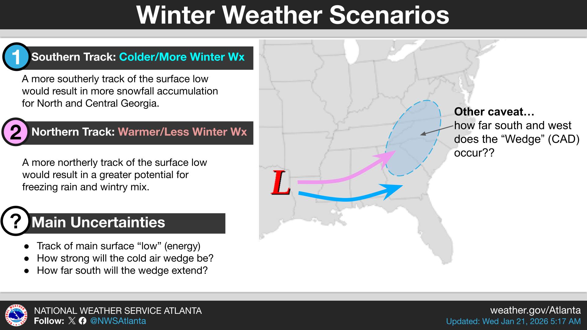 What’s Still Unknown: Three main uncertainties remain: the track of the main surface low pressure system, the strength of the cold air wedge, and how far south the wedge will extend. These factors will determine which areas see snow versus freezing rain.