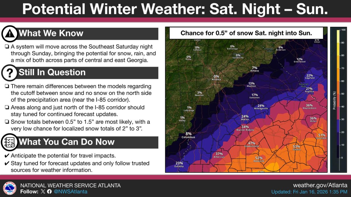 A weather system moving across the Southeast Saturday night through Sunday will bring the potential for snow, rain, and a mix of both across parts of central and east Georgia, according to the National Weather Service office in Peachtree City.