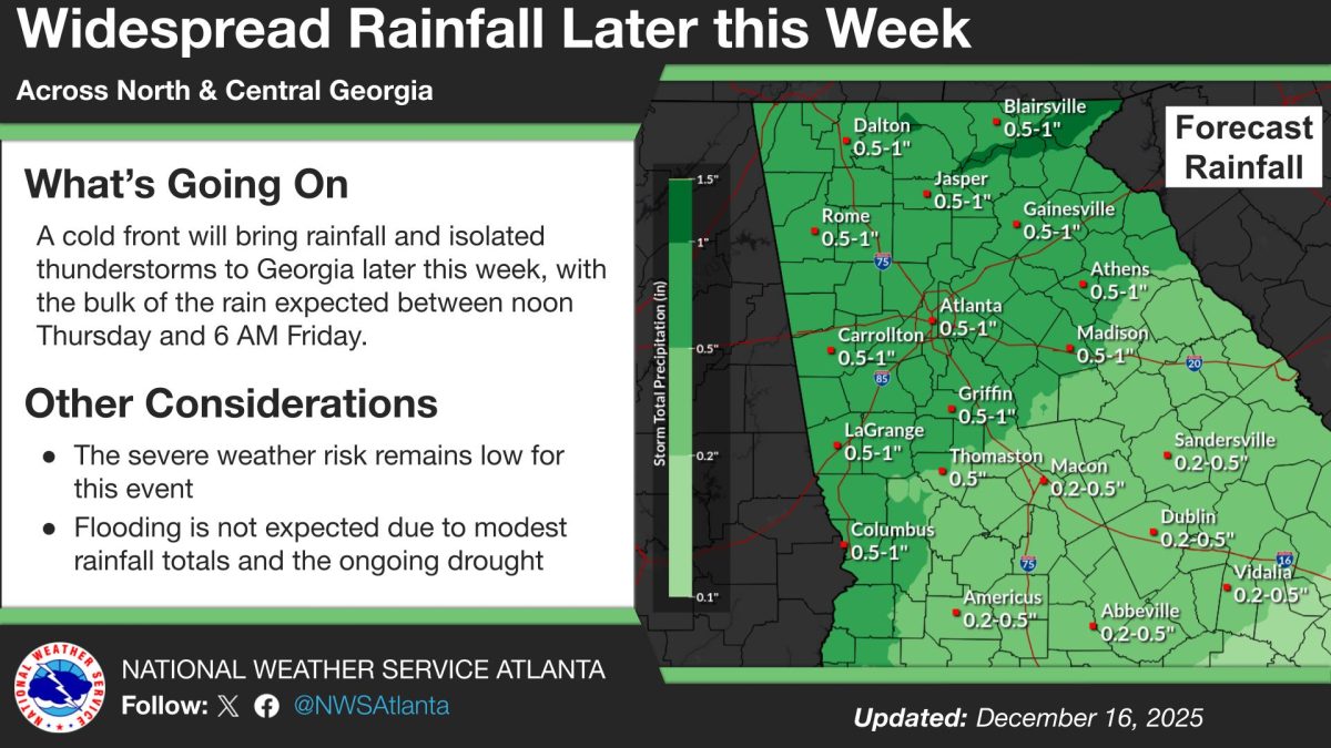 What’s Important: Many areas, including metro Atlanta and parts of north and west Georgia, could see about a half inch to 1 inch of rain. Lighter totals of about 0.2 to 0.5 inches are forecast across parts of central and eastern Georgia.
