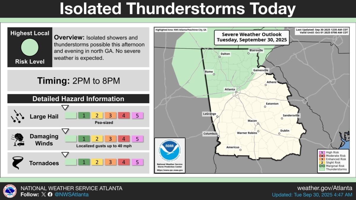 What’s Happening: The low clouds blanketing Georgia this morning will lift and break apart as the day goes on. Isolated showers and thunderstorms are most likely between 2 p.m. and 8 p.m., mainly in northern counties.