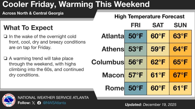 The Forecast Breakdown: The National Weather Service in Atlanta reports highs near 60 degrees Saturday and into the 60s Sunday for cities including Atlanta, Athens, Columbus, Macon, and Rome.